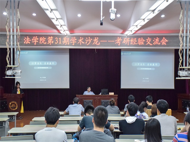 4月24日,法学院团委学生会学术部在模拟法庭举办了第31期主题为“廌存高远,砥砺共进”的法律学术沙龙活动。2015级的温晓洁、郑旭展和张凌翔为学弟学妹介绍法硕考研经验。