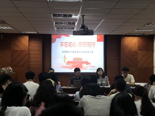 为进一步强化毕业生党员党性教育,切实做好毕业生党员“最后一公里”的教育管理服务工作, 6月10日下午,法学院党委在人文楼二楼会议室召开2019届毕业生全体党员大会。大会以“不忘初心,砥砺前行”为主题,院党委周延锋副书记、2018级辅导员郑晓玲老师、研究生辅导员张帆老师出席会议,法学院2019届毕业生全体党员参会。会议由2015级辅导员魏文桂老师主持。