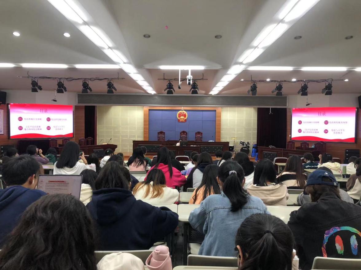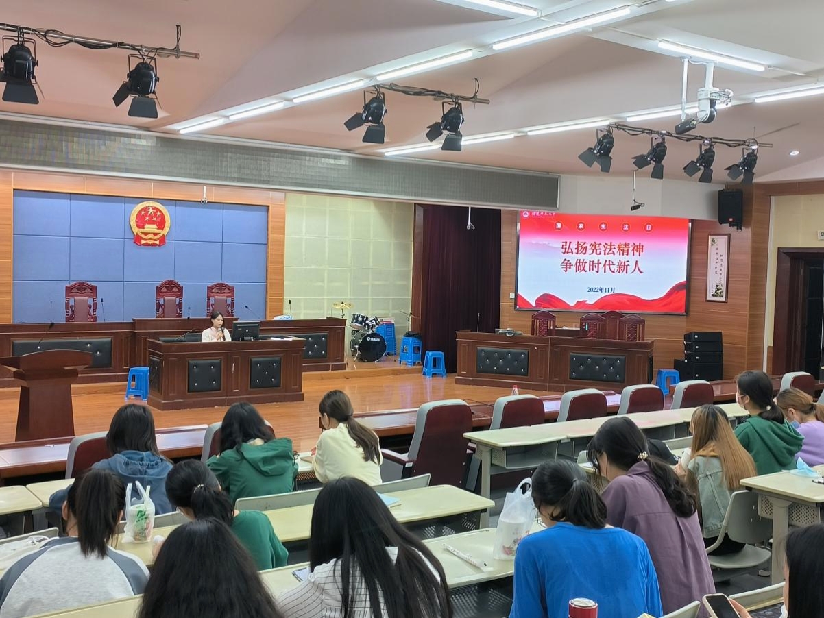 11月27日晚,法学院在模拟法庭开展以 “弘扬宪法精神,争做时代新人”为主题的集中教育。活动由2022级辅导员张秋华老师主讲,2022级全体新生出席。