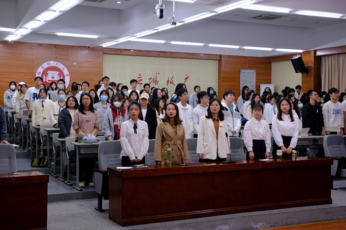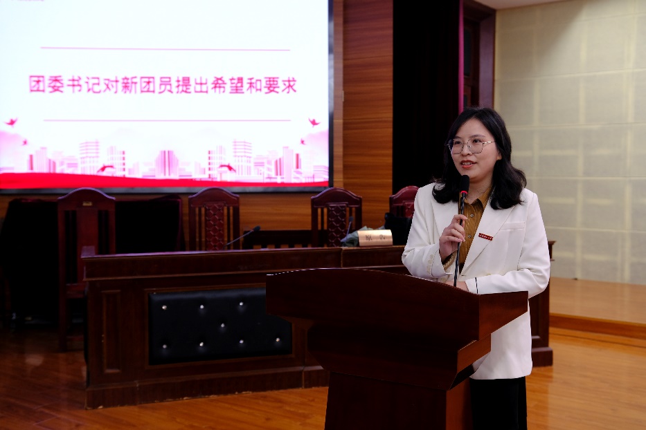 仪式伊始,张书萌同学向全体团员宣读新团员名单,向新团员颁发团员证和团徽,并由老团员们为新团员们佩戴团徽。在新团员们的左胸熠熠生辉的团徽,散发出磅礴的朝气与力量。随后,在法学院2021级团总支书记梁丹瑜老师的带领下,全体新老团员举起右拳、面向团旗庄严宣誓。会场里响彻着慷慨激昂的誓言,铿锵有力的誓言。