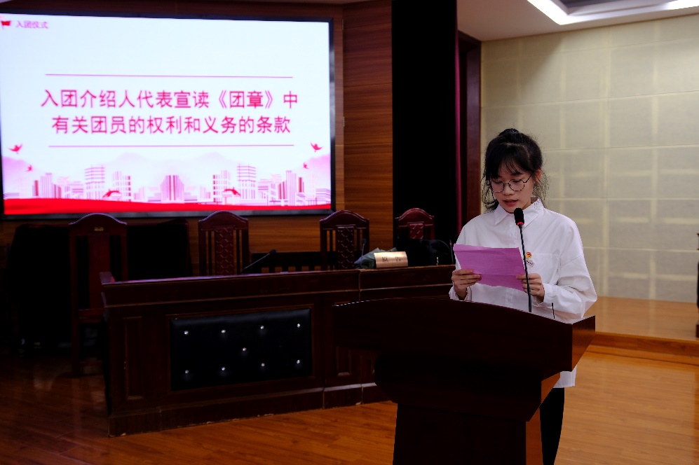 紧接着,入团介绍人代表沈逸欣宣读了《团章》中有关团员的权利和义务条款,希望团员们都能正确对待自己的权利和义务,提高自身素质、发挥模范作用。