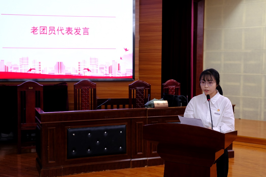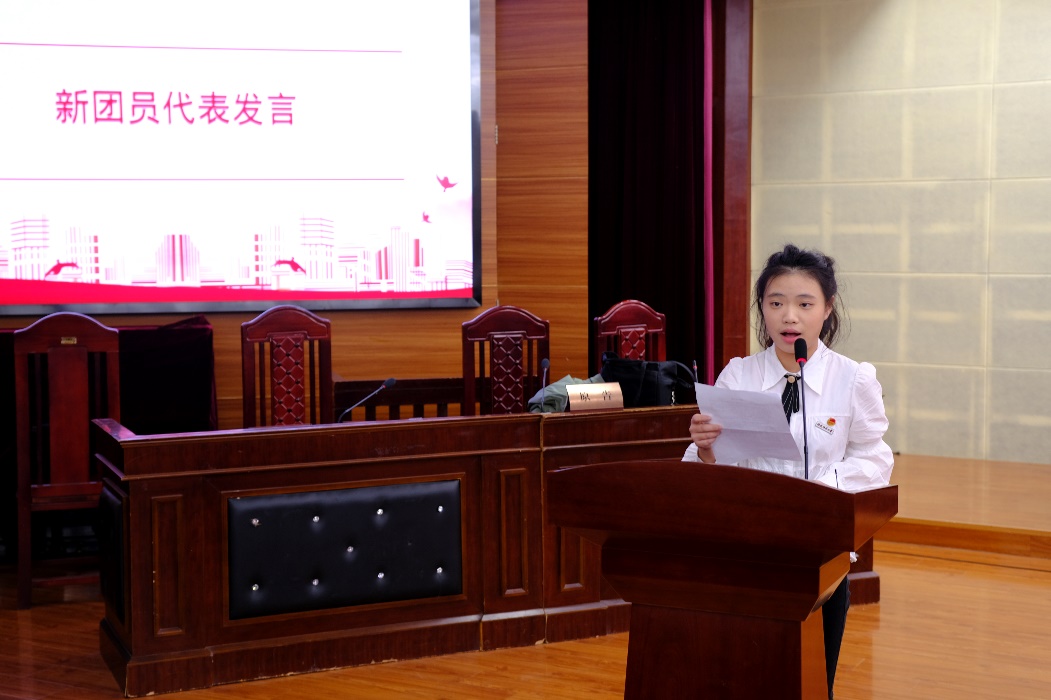 随后,新老团员代表相继发言。新团员代表潘雅煊同学向团组织保证自己将努力学习,认真工作,不辜负团组织的培养与期望。而老团员代表范姝涵同学则勉励新团员们积极进取,将入团作为奋斗的新起点,呼吁全体团员们要坚定目标、艰苦奋斗,发挥特长、积极进取,为团旗增辉光色,为团组织贡献自己的青春力量。