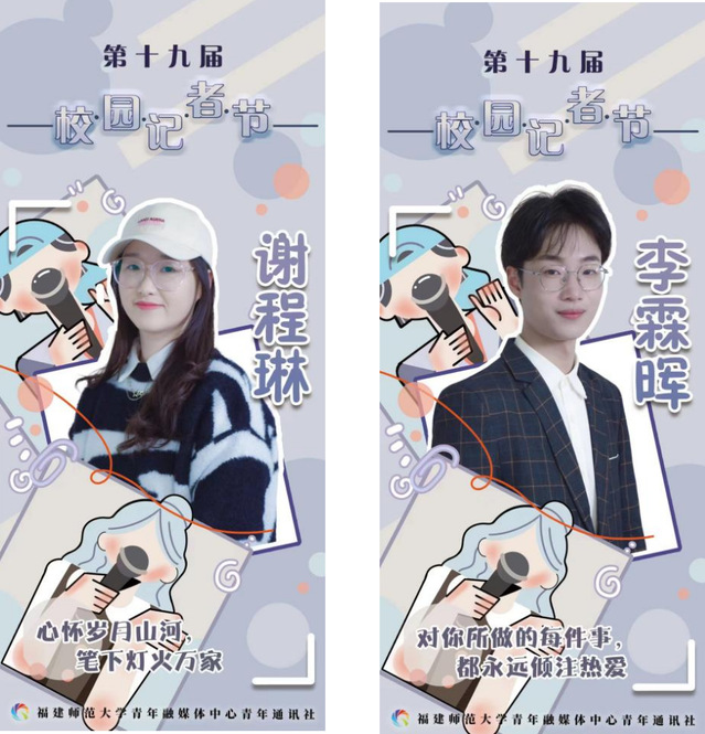 3月19日,由福建师范大学团委主办,校青年融媒体中心青年通讯社承办的第十九届校园记者风采大赛决赛在致广楼名师讲堂举行。经过激烈的角逐,我院2020级本科生谢程琳凭借出色的表现脱颖而出,斩获本次大赛的二等奖与最佳人气奖2022级本科生李霖晖获优秀奖。