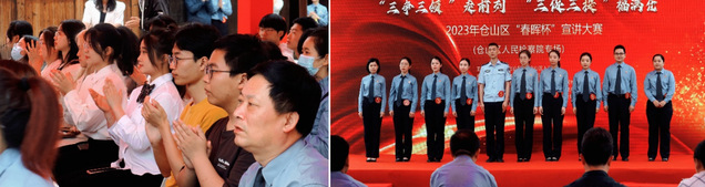 比赛现场,来自仓山区人民检察院的宣讲员们围绕着“促党建提升、促发展提速、促民生提质、文化建设、基层治理”这五个方面,以身边人讲身边事,以“小切口”讲“大道理”,声情并茂地宣讲了各自在基层的工作经历以及心得感悟,讲述了习近平法治思想在仓山区的具体实践,充分展现了新时代基层年轻干部的新气象新作为。同学们深深被宣讲员们的故事所打动,感悟良多。