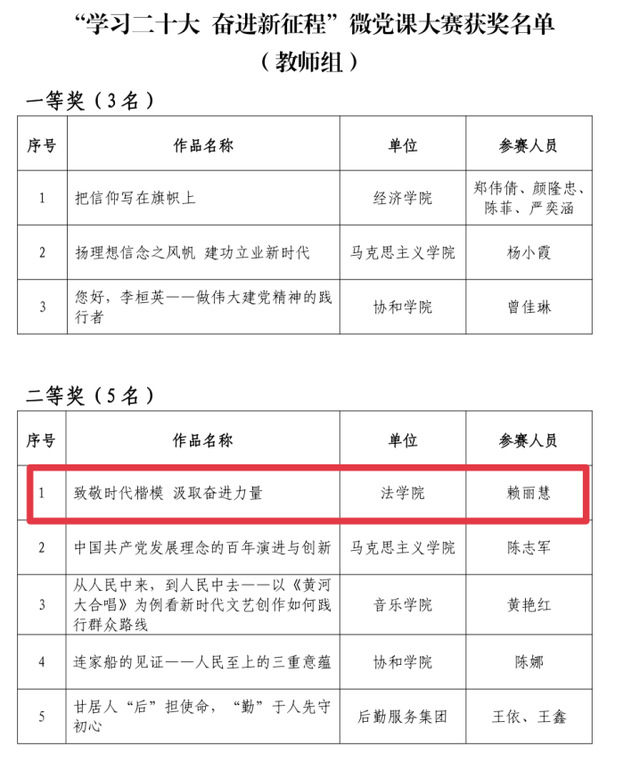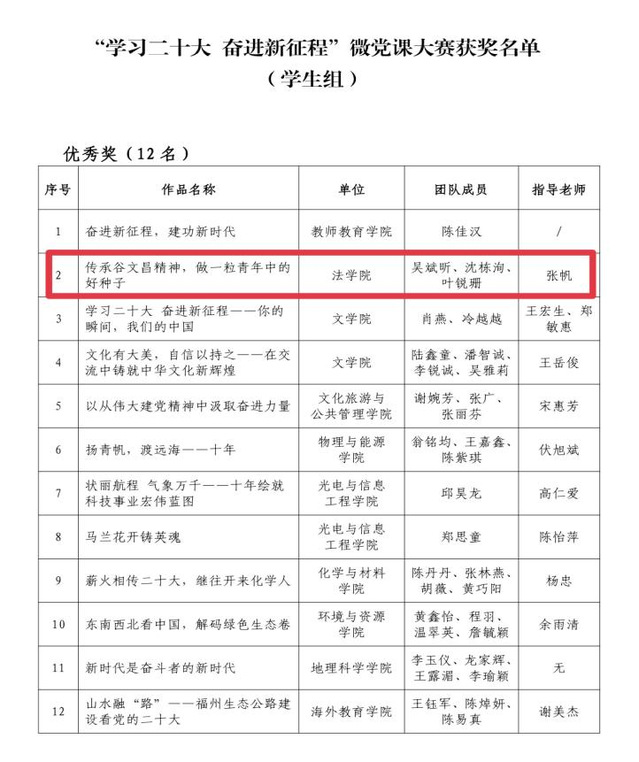 日前,中共福建师范大学委员会组织部公布“学习二十大,奋进新征程”主题微党课大赛获奖名单,我院辅导员赖丽慧作品《致敬时代楷模,汲取奋进力量》荣获教师组二等奖,我院研究生吴斌昕、沈栋洵、叶锐珊作品《传承谷文昌精神,做一粒青年中的好种子》荣获学生组优秀奖。据悉,本次大赛共评选出微党课大赛教师组一等奖3名、二等奖5名、三等奖8名、优秀奖11名,学生组一等奖3名、二等奖5名、三等奖8名、优秀奖12名