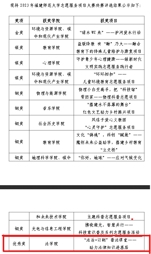2023年4月,由学校共青团委组织开展的“2023年福建师范大学志愿服务项目大赛”落下帷幕,经过各学院申报,校团委审核,评委初评,决赛路演答辩,我院作品《“法治+订制”普法课堂——助力法律法律知识进基层》获得优秀奖。