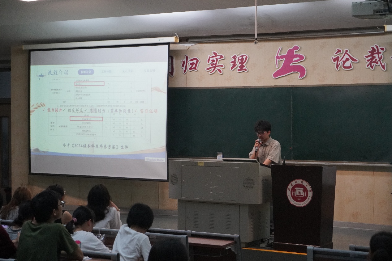 为切实增长学子实践才干、提升专业素养与综合能力,帮助 2025 级新生更快适应学业节奏、明确实践成长路径,9月23日晚,我院于立诚 2 号楼名师讲堂成功举办 “扬帆计划” 宣讲交流会。本次会议特邀 2024 级陈乐妍、李宗乾两位同学分享实践经验,2025 级全体新生到场参与。