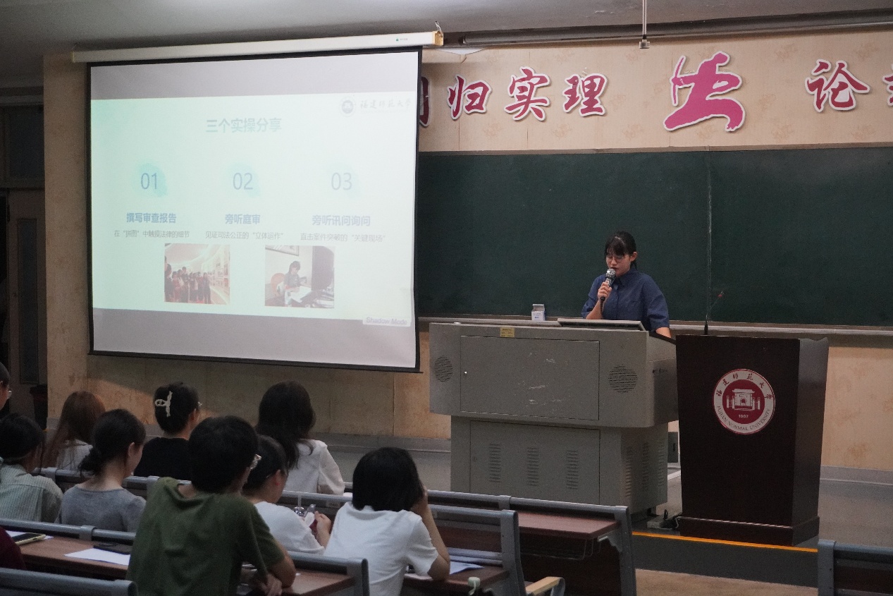 交流会伊始,陈乐妍同学以自身在检察院的实习经历为切入点,结合专业实践场景,将实习内容提炼为 “撰写审查报告”“旁听庭审”“参与讯问询问” 三大核心实操模块,用具体案例拆解每项工作的流程与要点,让新生对法律实务工作有了直观认知。谈及实习收获时,陈乐妍坦言,这段经历不仅让她亲身见证了司法制度的实际运作过程,更在严谨的工作要求中锻炼了逻辑思维与细节把控能力,“在协助处理案件的过程中,我逐渐体会到司法公正的重量,也更加明白专业知识与实践结合的重要性”。她鼓励新生们主动把握 “扬帆计划” 等实践机会,在实践中积累经验、明确职业方向。