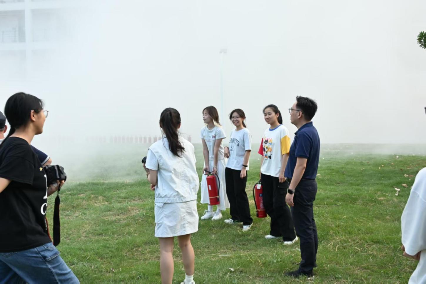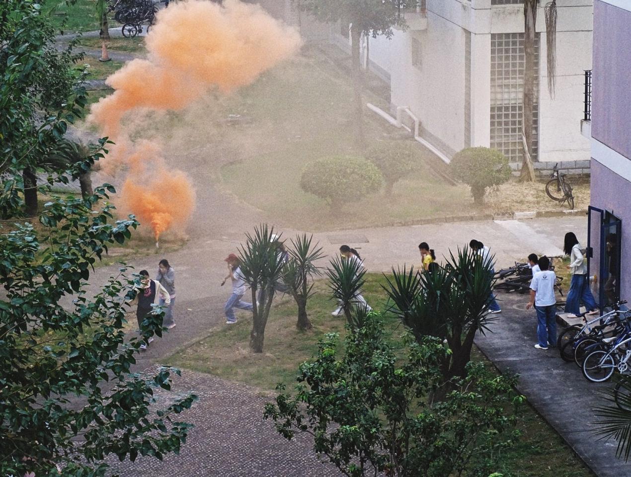 下午四点整,模拟烟雾装置准时启动,模拟火情的烟雾迅速扩散,消防警报也随之响起,师生们迅速响应:立即用湿毛巾捂好口鼻,快速离开宿舍,弯腰低姿,在疏散引导员指引下沿安全路线有序转移。仅用340秒,全体人员便安全抵达桂苑16号楼后侧草坪处的安全地带,完成人员清点,疏散过程高效有序。
