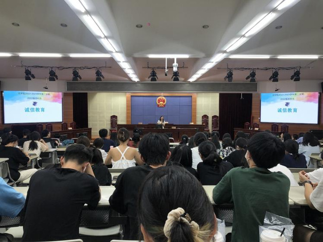 为进一步规范考风考纪,营造厚德尚学的良好氛围,6月4日,法学院、纪检监察学院2022级在模拟法庭开展“诚信考试”主题教育,活动由2022级辅导员金君敏主持,2022级全体同学参与。