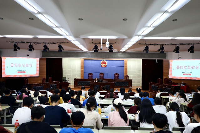 为了切实加强暑期安全教育,提升学生暑期安全意识,6月25日,2022级辅导员金君敏老师与张秋华老师在模拟法庭开展以暑期安全教育为主题的集中教育活动,2022级本科生全体参与。