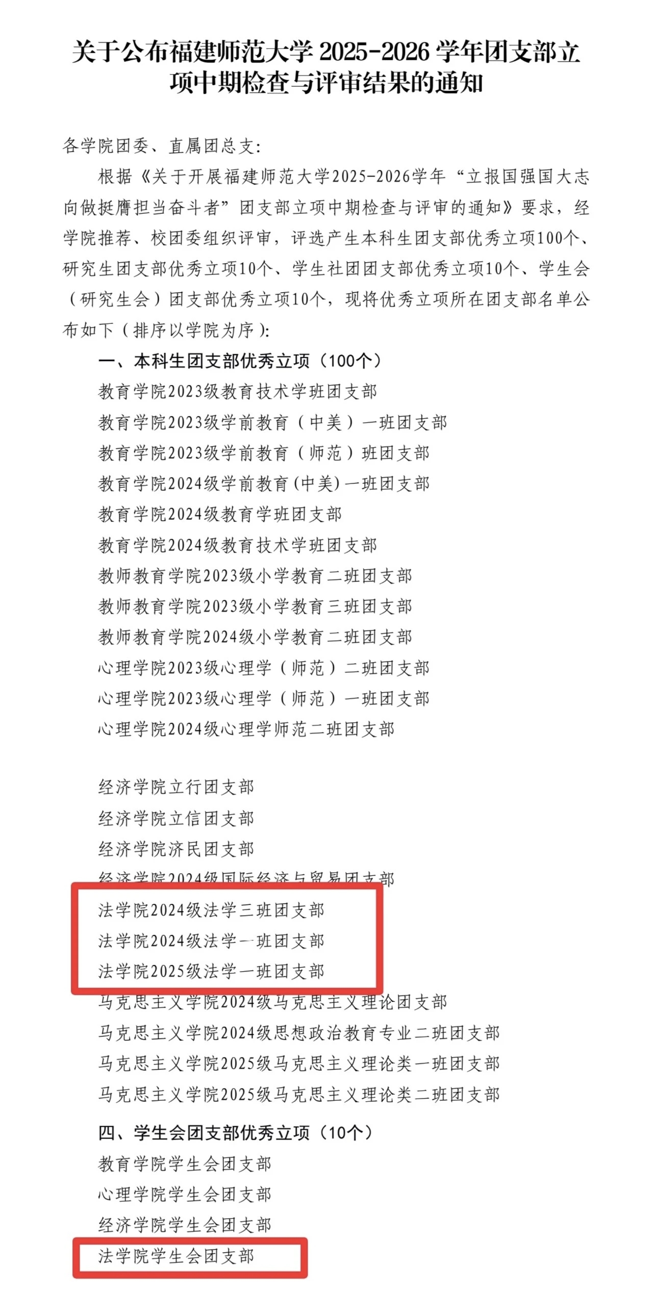 近日,校团委发布《关于公布福建师范大学2025-2026学年团支部立项中期检查与评审结果的通知》,经学院推荐、校团委组织评审,我院获评