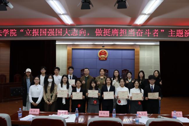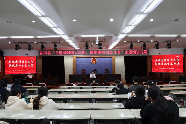 为深入贯彻落实新时代立德树人根本任务培养有理想、敢担当的新时代青年1128日晚,我院在模拟法庭举办“立报国强国大志向,做挺膺担当奋斗者”主题演讲比赛决赛。本次比赛特邀2023级辅导员张桢远、2024级辅导员郑佳欣、2025级辅导员胡秀燕,以及传播学院郭笑嫚、陈静怡同学担任评委。