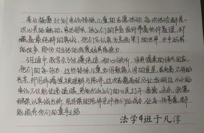 一通通电话,连接起校园与社会;一句句问候,承载着法学青年的温情与责任。同学们在服务中观察社会,在沟通中锻炼能力,在奉献中收获成长。这份“云端”守护,不仅为孩子们送去了温暖,也在同学们心中播下了关怀与责任的种子。