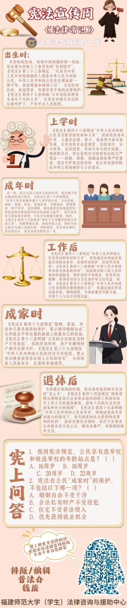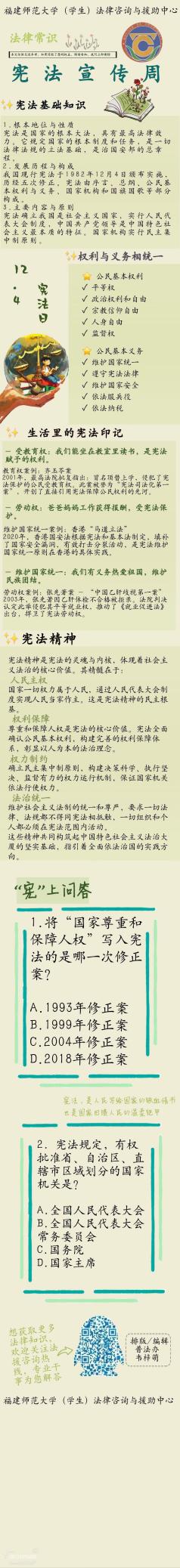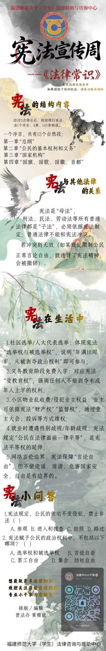 2025124日,第十二个“国家宪法日”如期而至。连日来,福建师范大学(学生)法律咨询与援助中心围绕“学习宣传贯彻习近平法治思想,推动宪法深入人心”主题,多种形式深入开展“宪法宣传周”活动,大力弘扬宪法精神,为营造尊法、学法、守法、用法的法治氛围注入青春力量。
