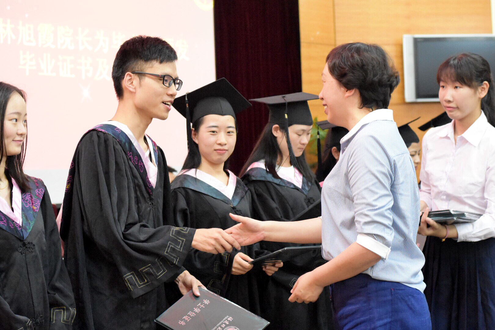 在随后的捐赠仪式上,毕业生代表郑中正、简婧代表全体毕业生向法学院捐赠纪念品,李峰书记代表学院接受捐赠。最后,林旭霞院长向全体毕业生颁发毕业证书及学位证书。